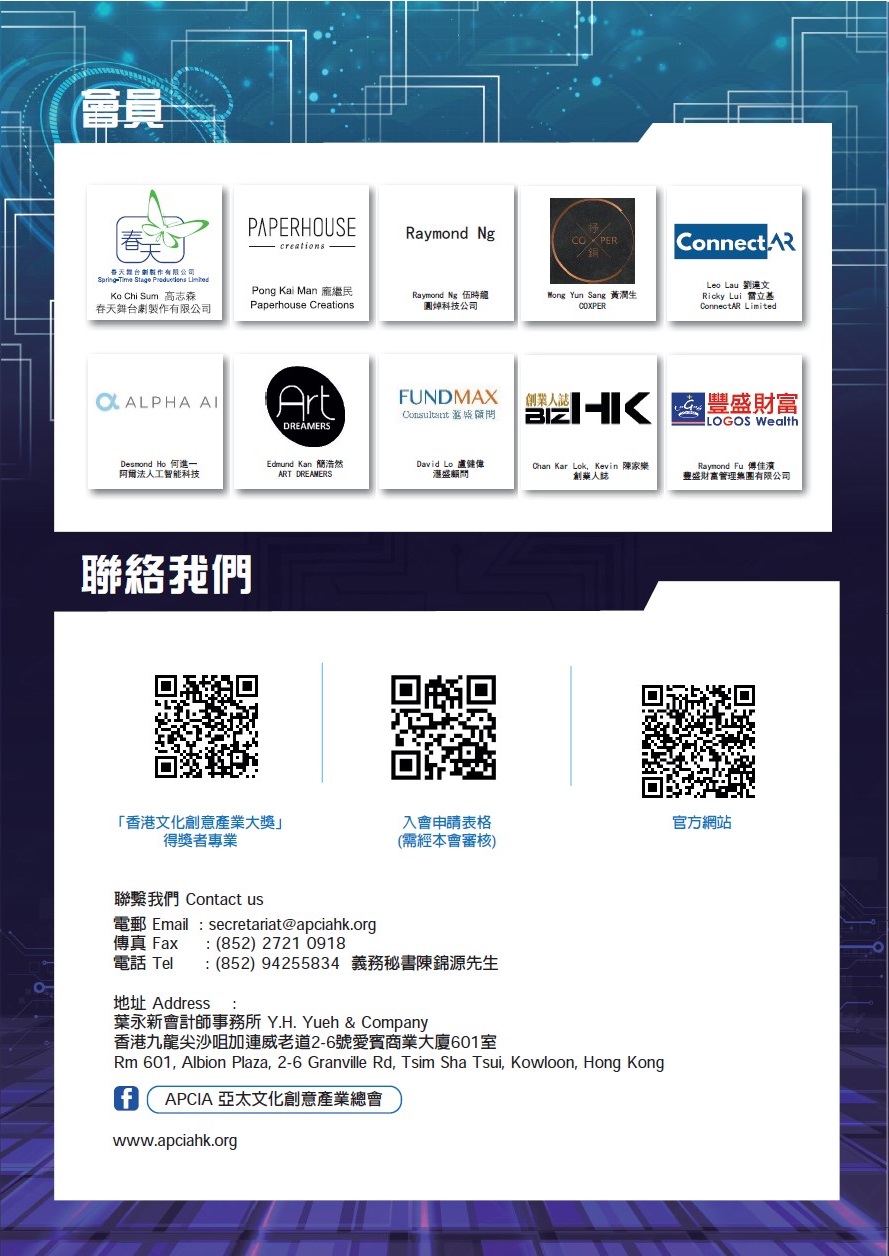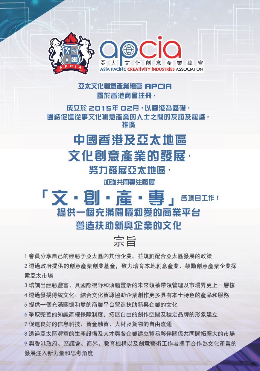 「亞太文化創意產業總會」(APCIA) 屬於香港商會註冊成立於2015年02月, 以香港為基礎,團結促進從事文化創意產業的人士之間的友誼及認識,推廣中國香港及亞太地區文化產業的發展,努力發展亞太地區,加強共同專注發展「文 • 創 • 產 • 專」各項目工作!提供一個充滿關懷和愛的商業平台營造扶助新興企業的文化。